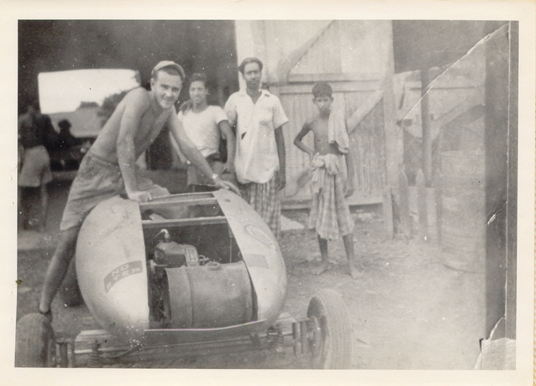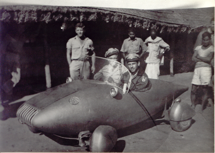 This car was designed and built by George Trotter out of old aircraft parts at an airfield near Dacca, India ( now known as Dhaka, Bangladesh ) during World War II.