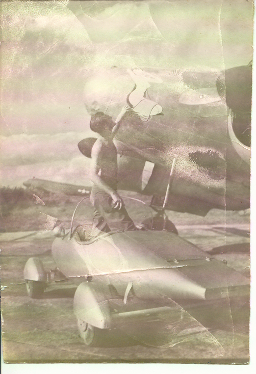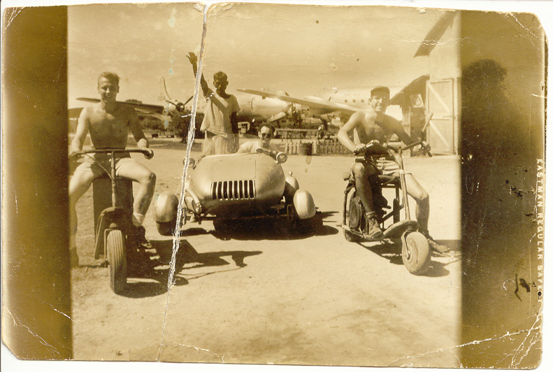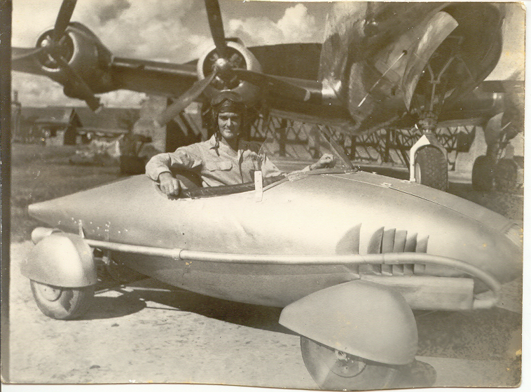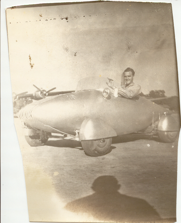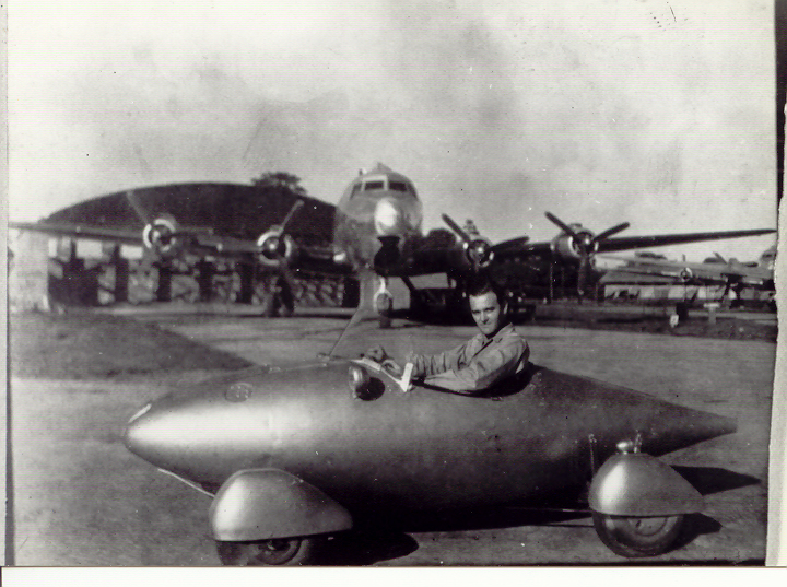 George Trotter and the car without the strip of wing metal showing the fuel tank and generator engine used to power the electric aircraft starter motors on each wheel. George Trotter in the car with a Douglas C-54 Skymaster transport in the background