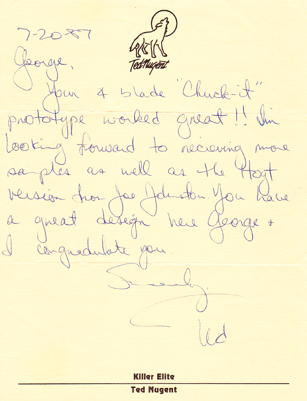 A letter from Ted Nugent to George Trotter about Chuck-It Broadhead. July 1987. Click here for larger image.