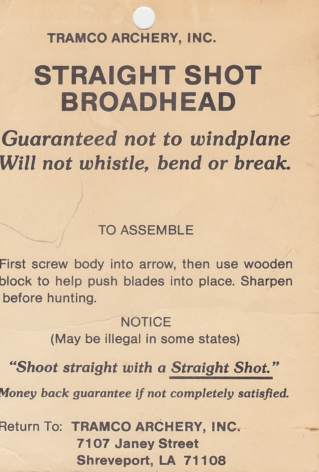 A tag from a package of Straight Shot broadheads sold by George Trotter's company named TRAMCO (Trotter Research And Manufacturing Company) Click here for larger image