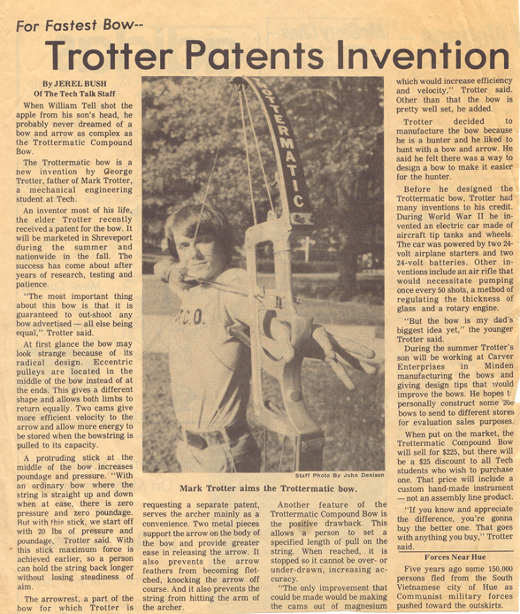 The Trottermatic Compound Bow was invented and developed by George Trotter in the early 1970's.